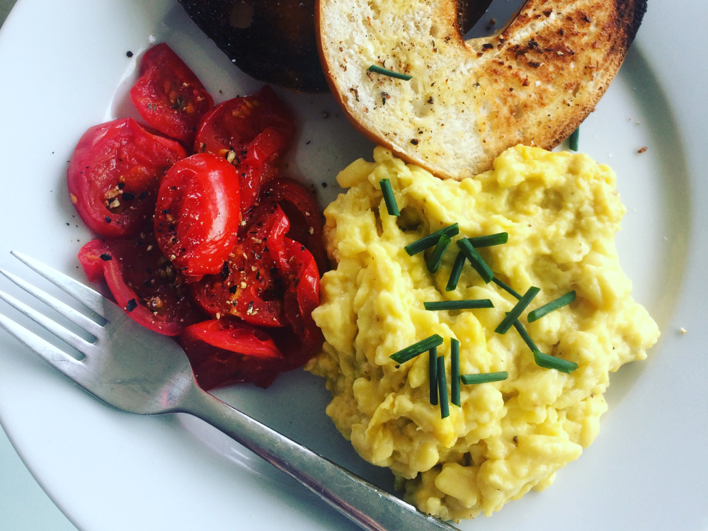 Keep scrambling for about 6 minutes and you’re good to go, sling on some chilli flakes, chives or hot sauce if you wish and enjoy.