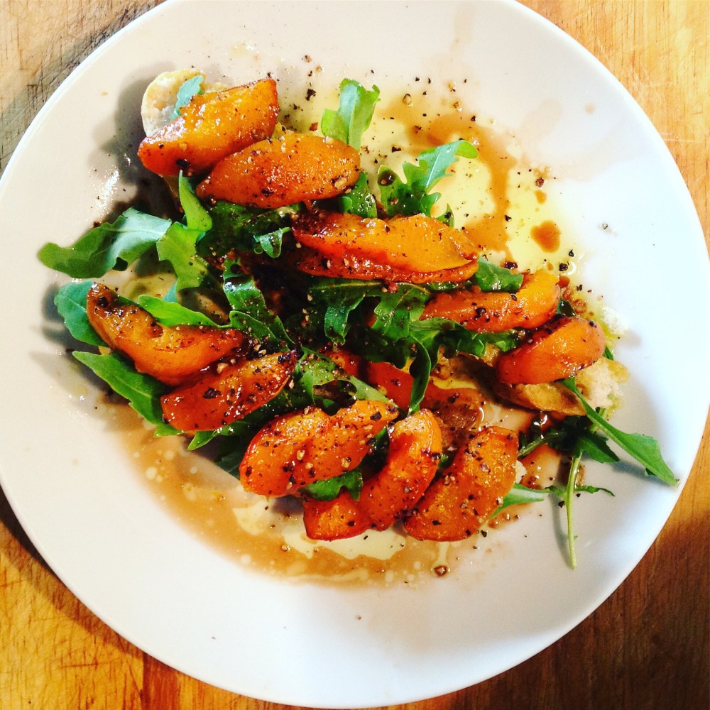 When the apricots are ready line up your toasts and layer on the rocket and apricots then drizzle with some more oil and balsamic vinegar and there you are!